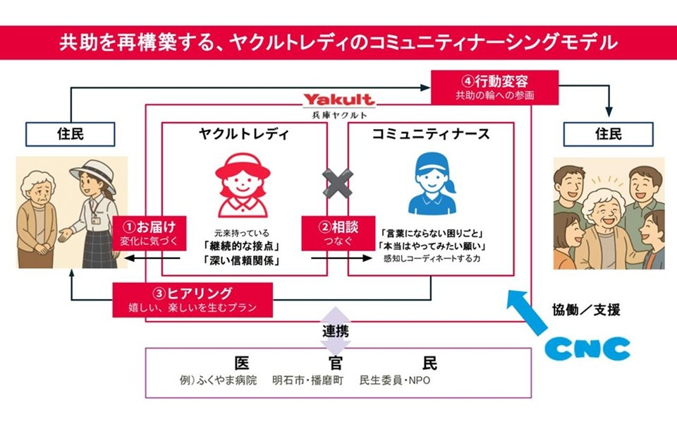 日々のお届けの中で、地域の方の心や体のちょっとした変化に気づいた”ヤクルトレディ”が、願いや希望を見出し・活かし・コーディネートする”コミュニティナース”と協働し、地域の人が地域の共助の輪につなげていく取り組みです。